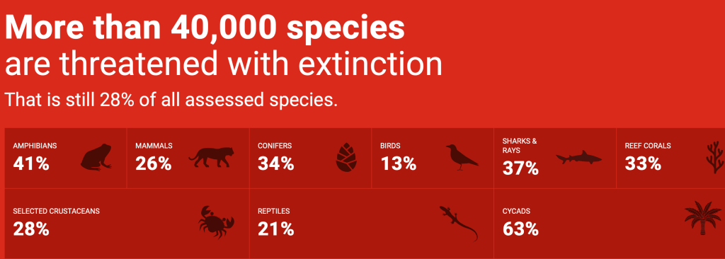 International Union for Conservation of Nature (IUCN) is an amazing organisation that focuses on conservation & sustainability. IUCN Red List is a comprehensive record of the conservation status of plants & wildlife. Indicates whether a species is already extinct or how likely will an existing group go extinct in the near future.