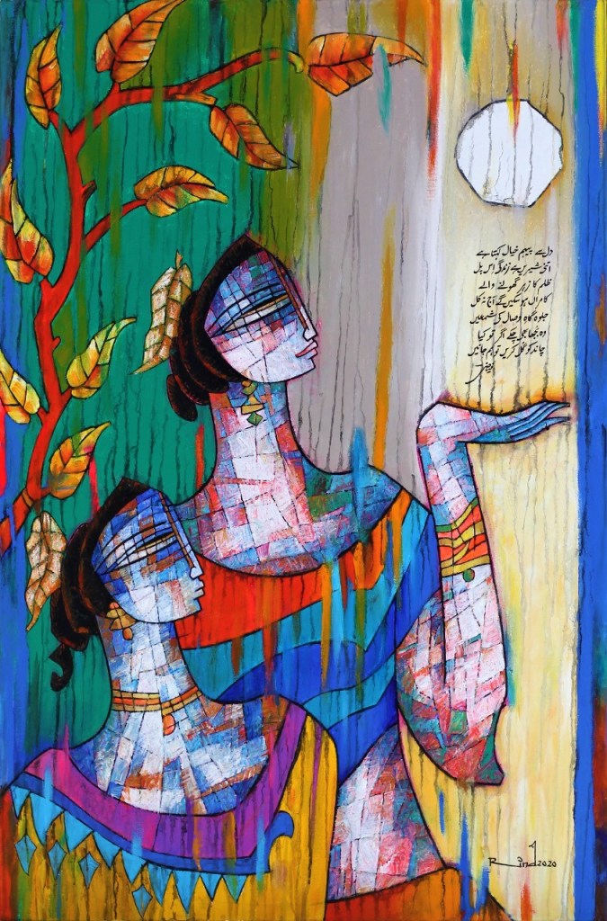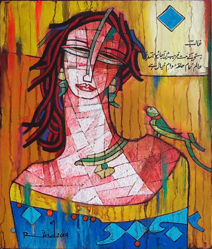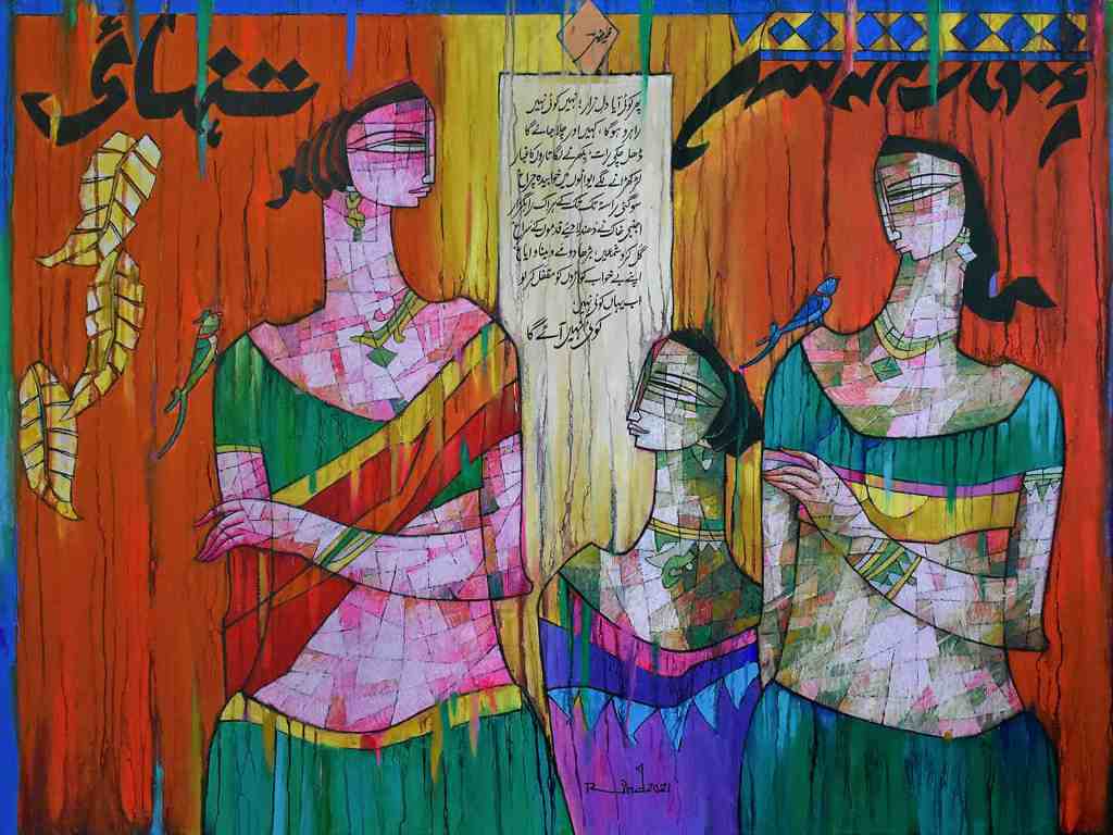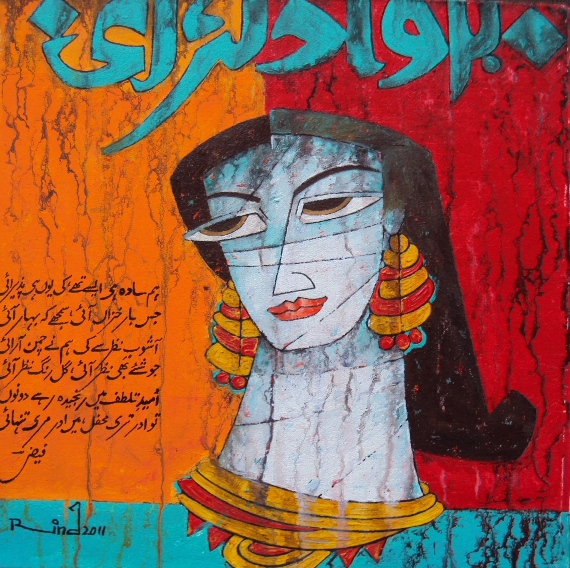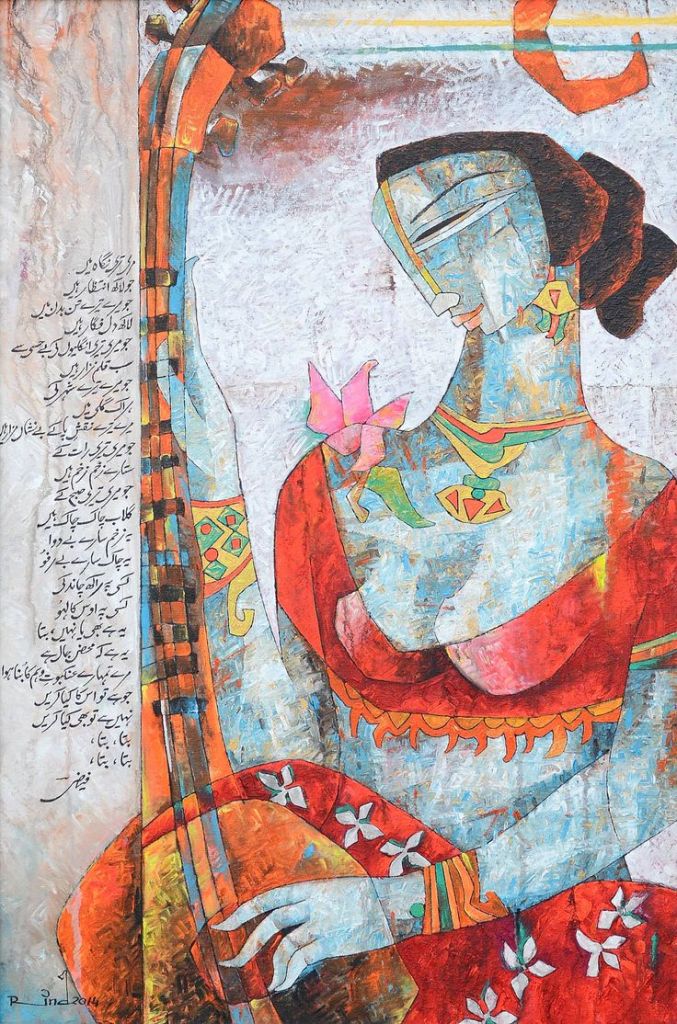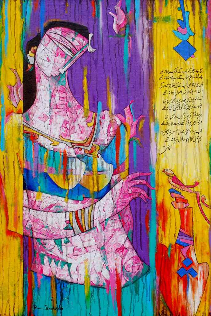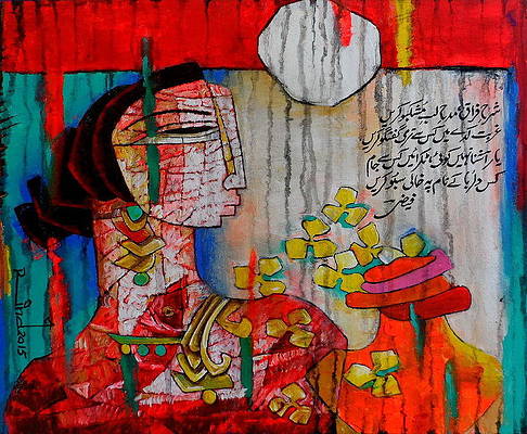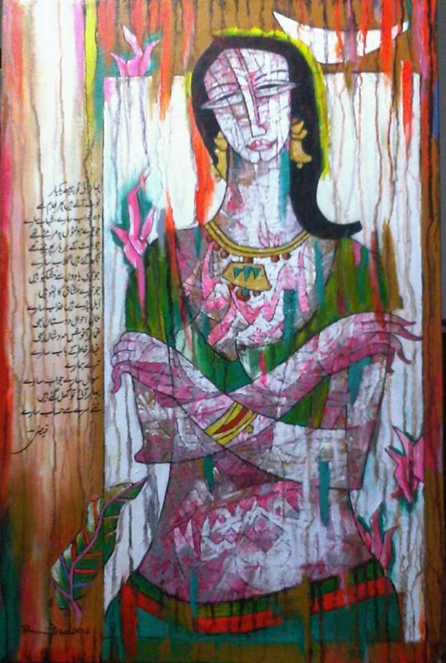 A.S.Rind – a world renowned artist based in Pakistan. Artworks are inspired by the poetry of masters – Ghalib, Faiz Ahmed Faiz & Alama Iqbal. Rind portrays delicate female forms in colourful traditional dresses, jewellery & classic ethnic symbols accompanied with their poetry.