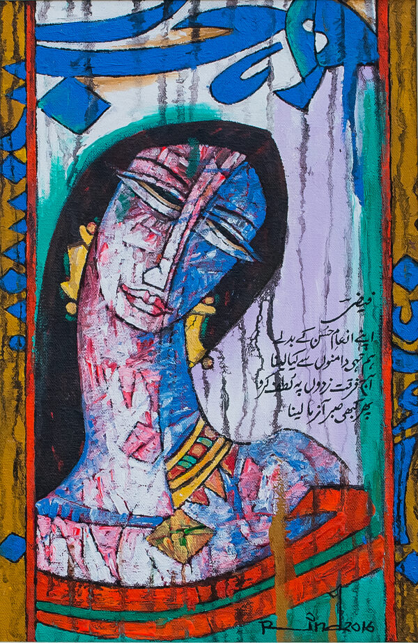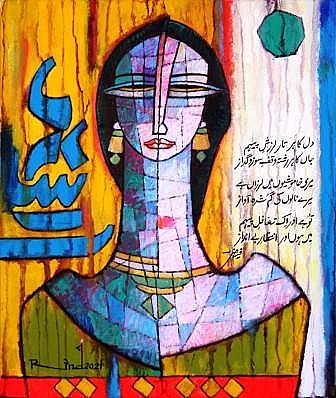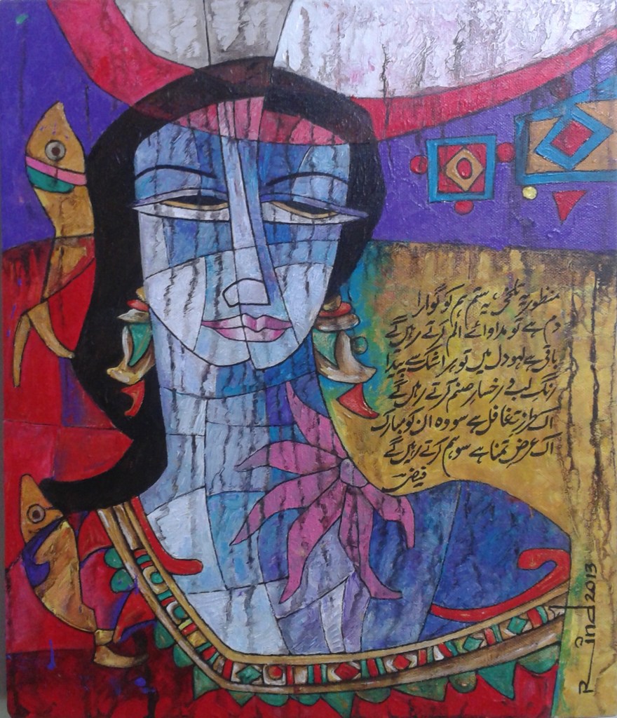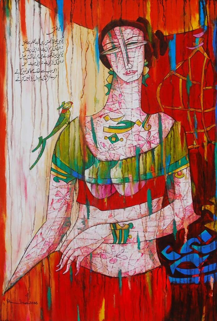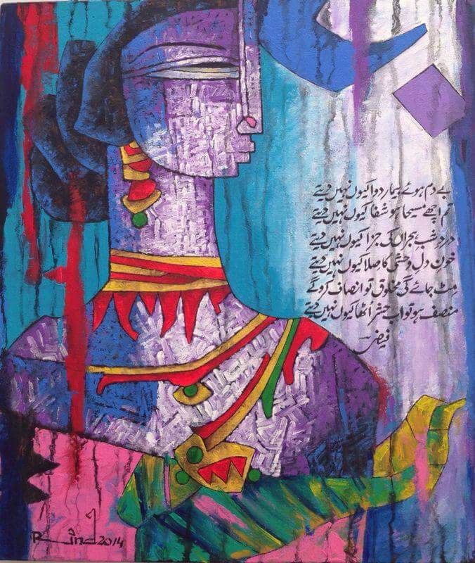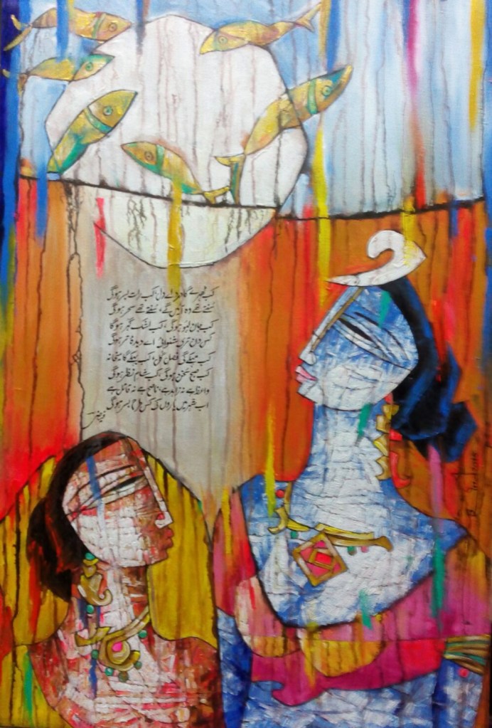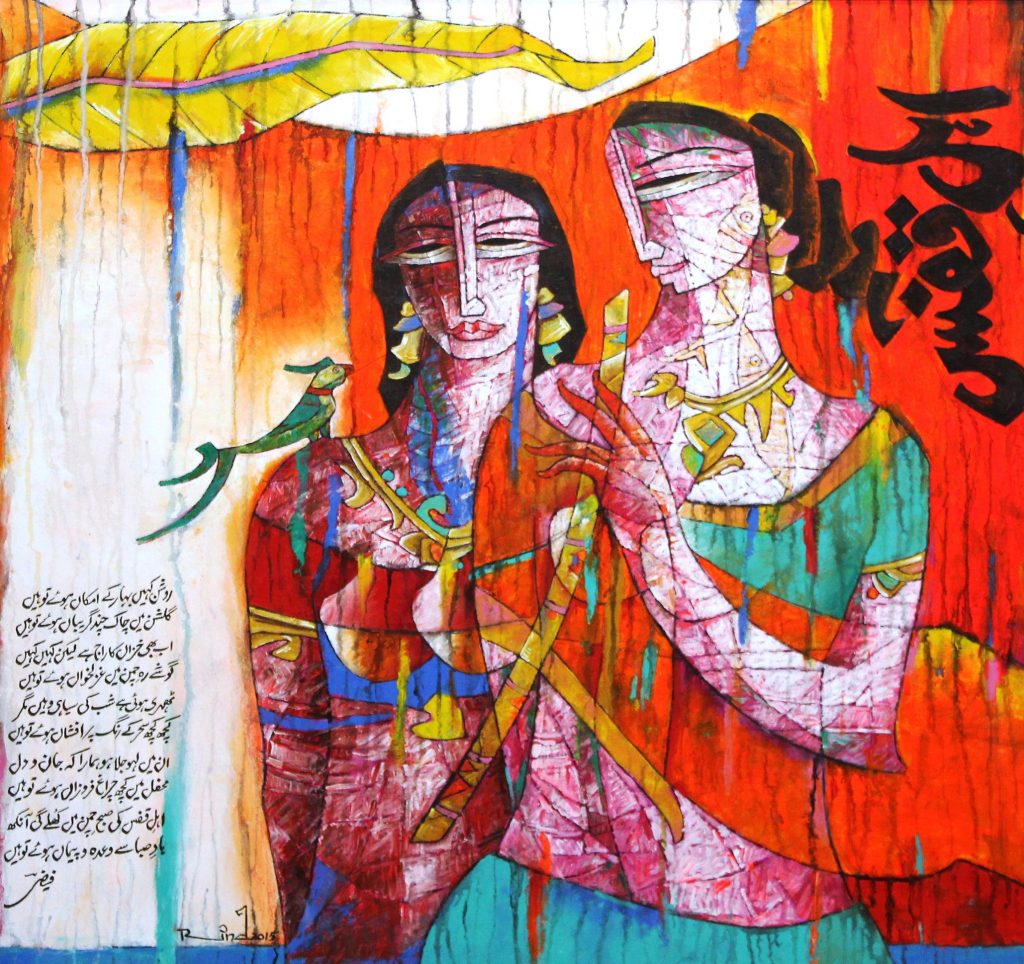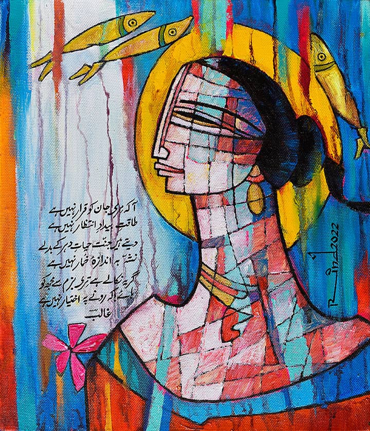 A.S.Rind – a world renowned artist based in Pakistan. Artworks are inspired by the poetry of masters – Ghalib, Faiz Ahmed Faiz & Alama Iqbal. Rind portrays delicate female forms in colourful traditional dresses, jewellery & classic ethnic symbols accompanied with their poetry.