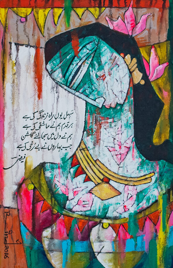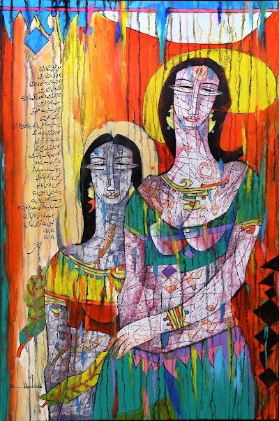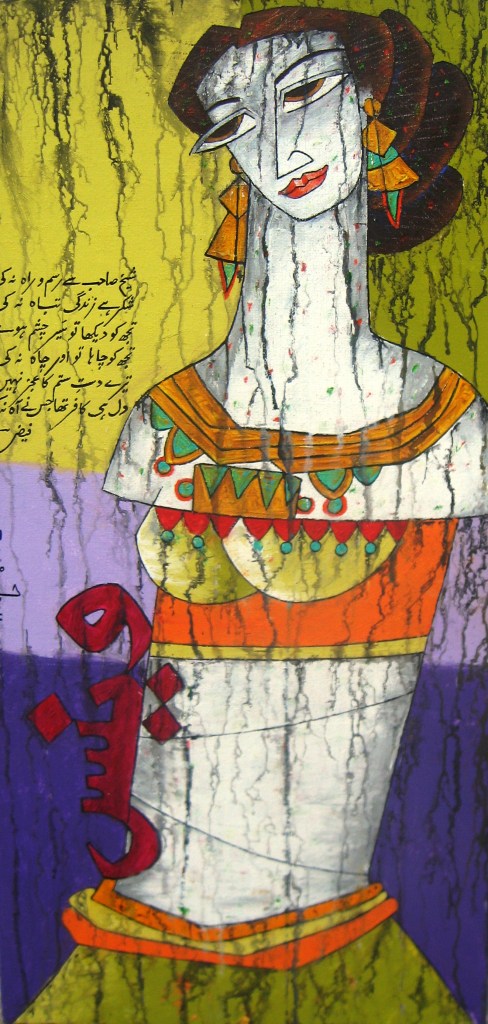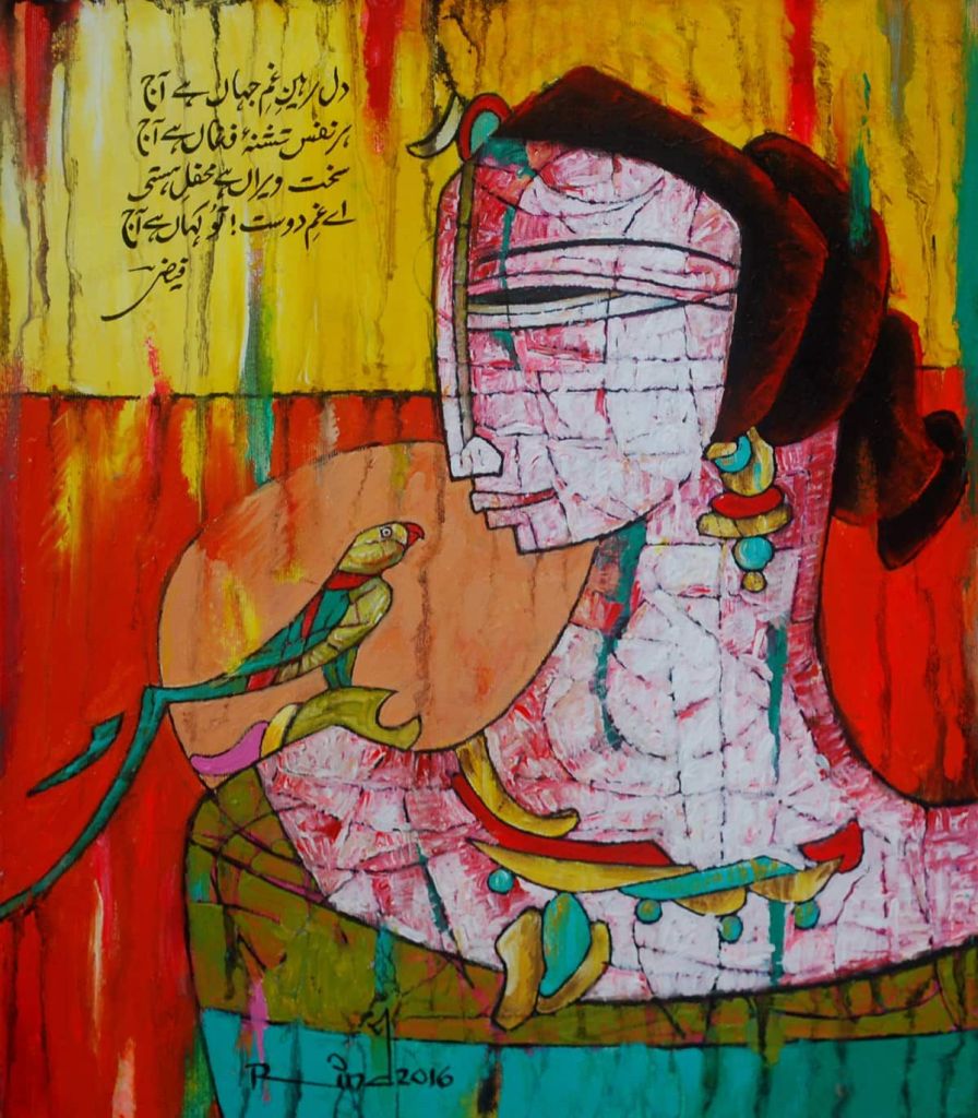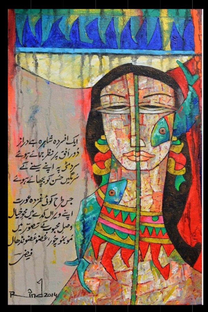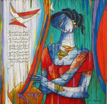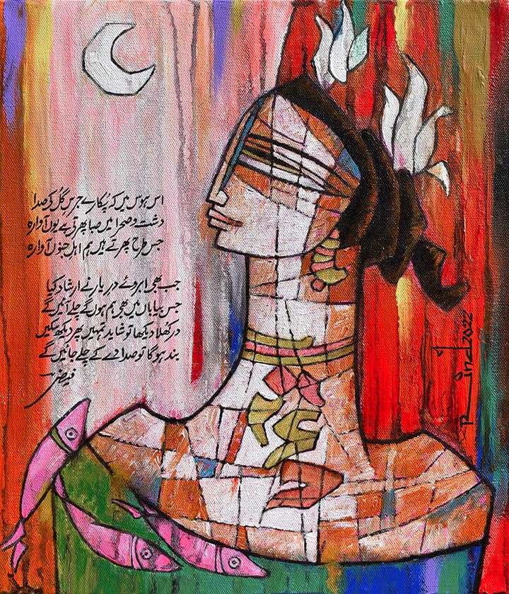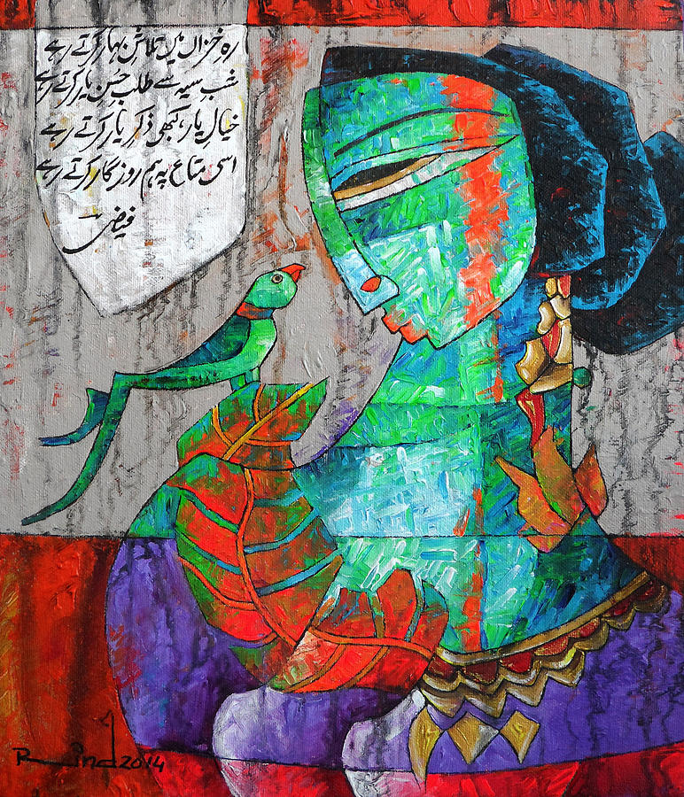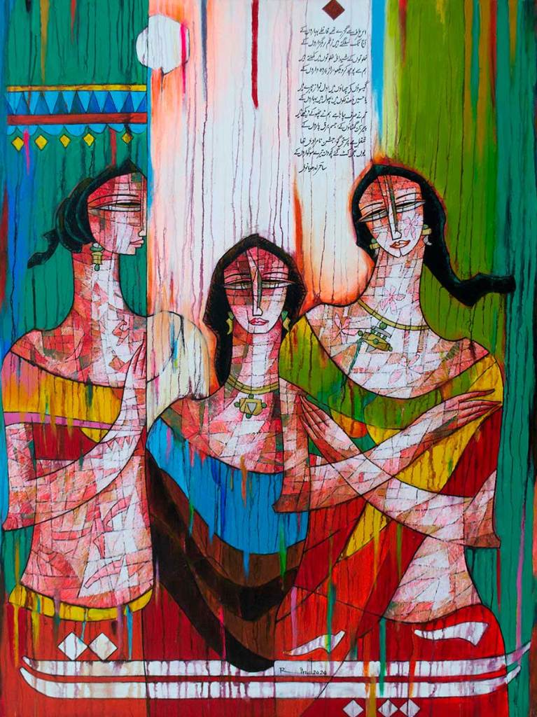 A.S.Rind – a world renowned artist based in Pakistan. Artworks are inspired by the poetry of masters – Ghalib, Faiz Ahmed Faiz & Alama Iqbal. Rind portrays delicate female forms in colourful traditional dresses, jewellery & classic ethnic symbols accompanied with their poetry.