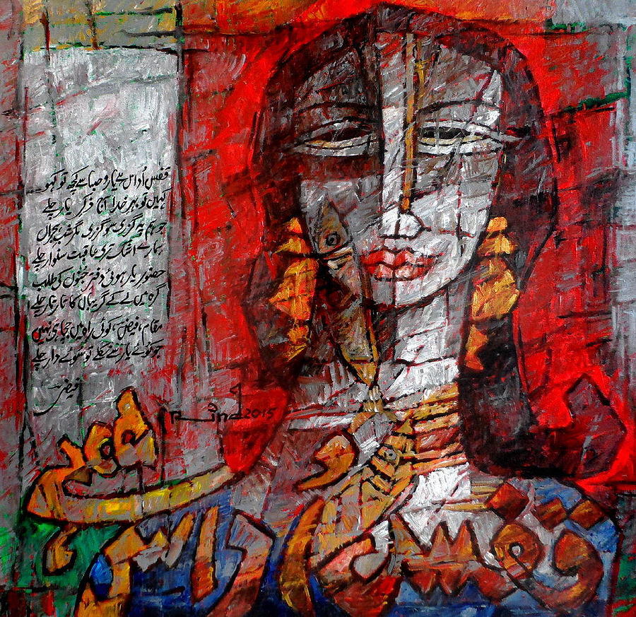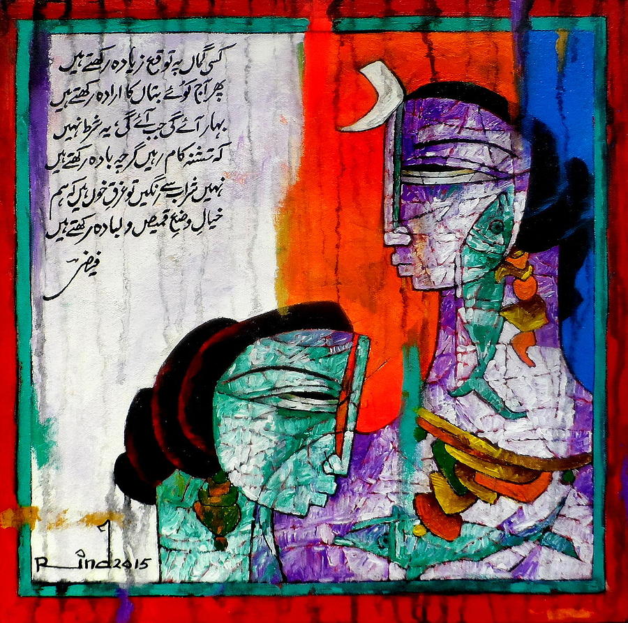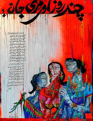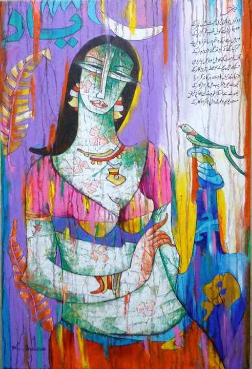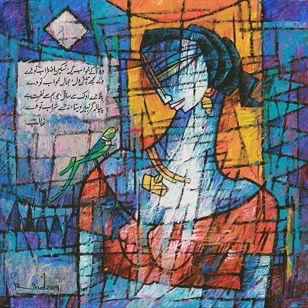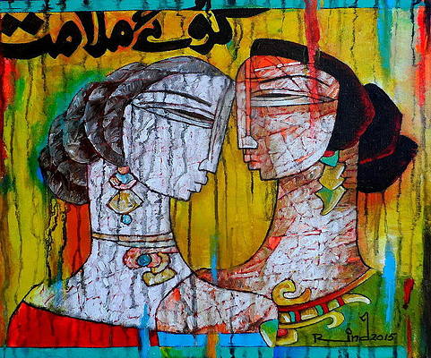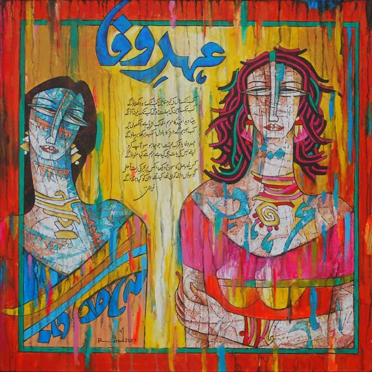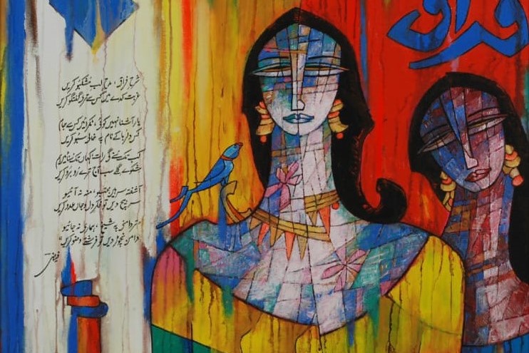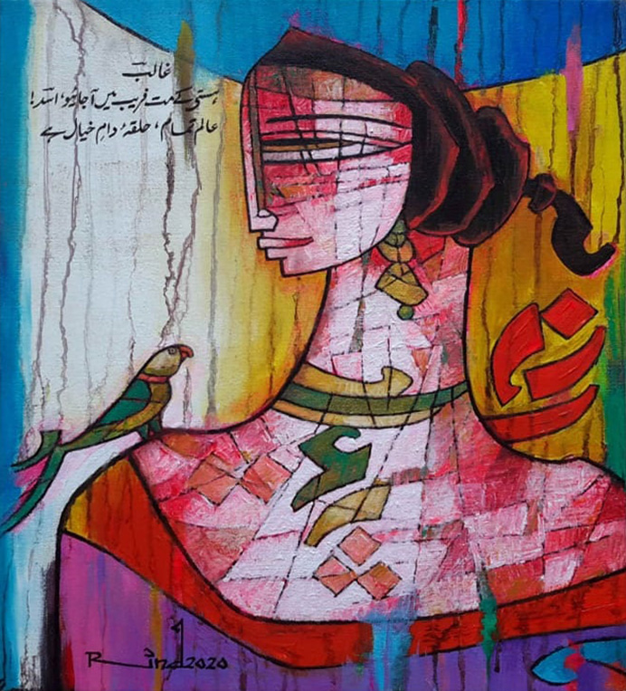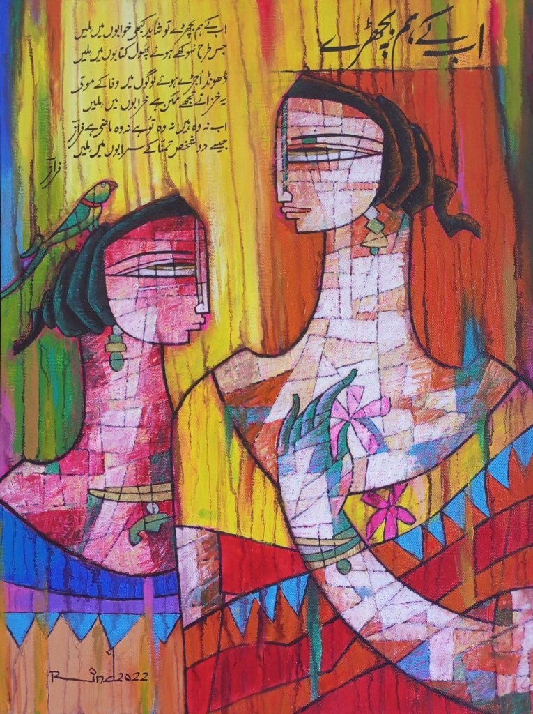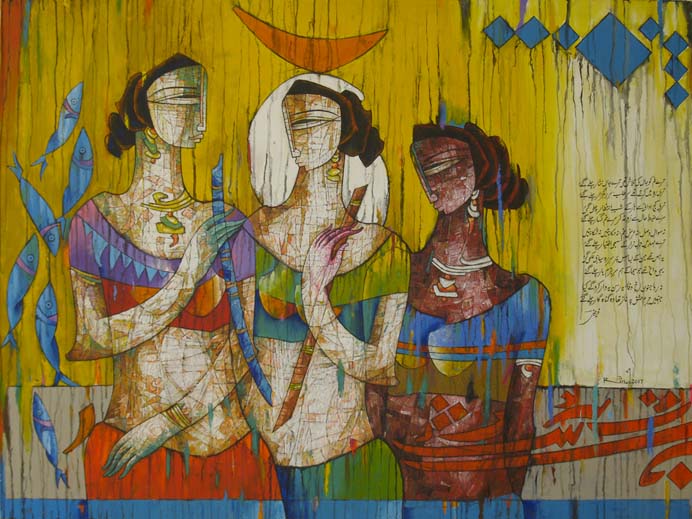 A.S.Rind – a world renowned artist based in Pakistan. Artworks are inspired by the poetry of masters – Ghalib, Faiz Ahmed Faiz & Alama Iqbal. Rind portrays delicate female forms in colourful traditional dresses, jewellery & classic ethnic symbols accompanied with their poetry.