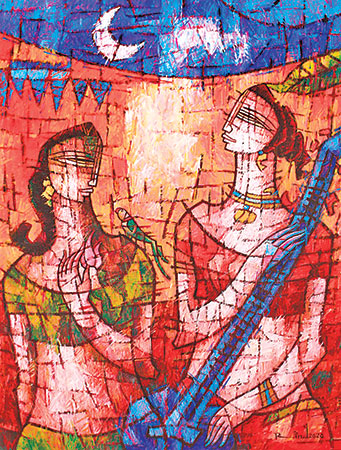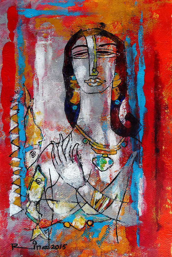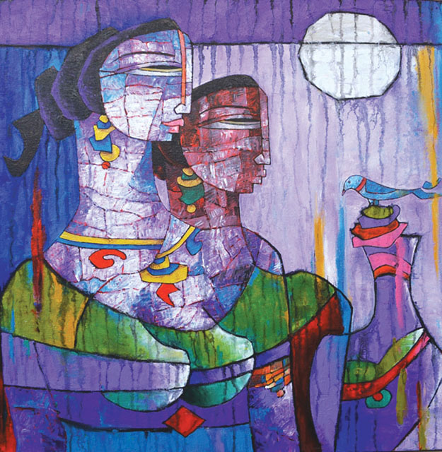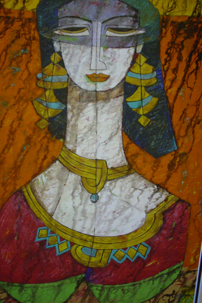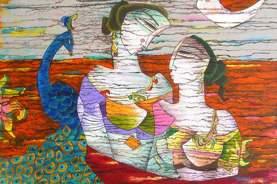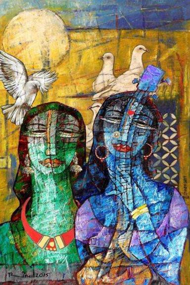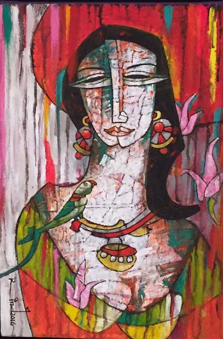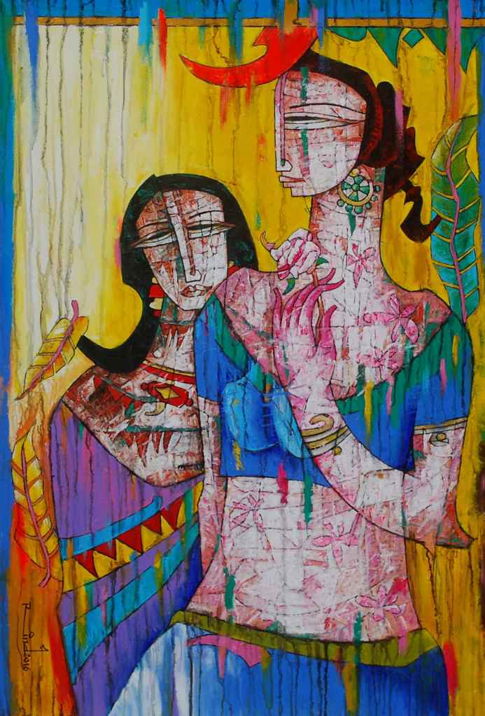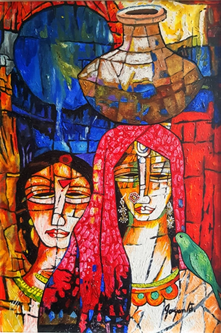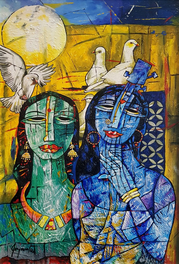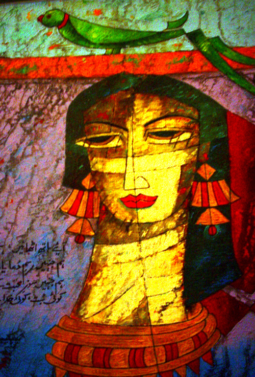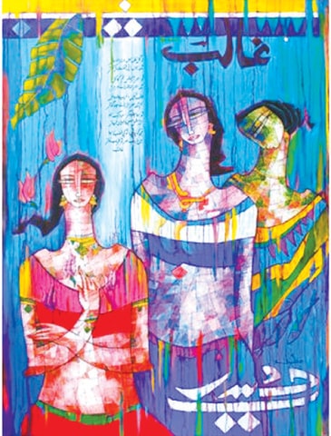 A.S.Rind – a world renowned artist based in Pakistan. Artworks are inspired by the poetry of masters – Ghalib, Faiz Ahmed Faiz & Alama Iqbal. Rind portrays delicate female forms in colourful traditional dresses, jewellery & classic ethnic symbols accompanied with their poetry.